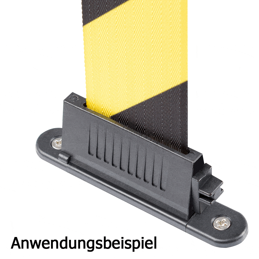 - Das Gurtende kann einfach mit einem Wandclip oder einem Gurtabsperrpfosten verbunden werden
